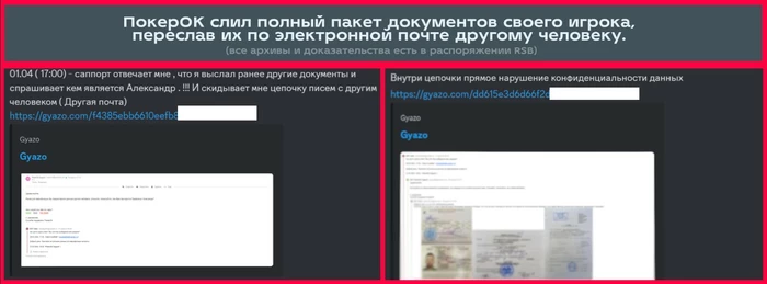 Во вложениях к той цепочке были паспорт, справка о подтверждении места жительства, данные банковского счёта. Полный пакет документов абсолютно другого человека по имени Александр ПокерОК переслал нашему Александру (доказательства есть в распоряжении RSB).