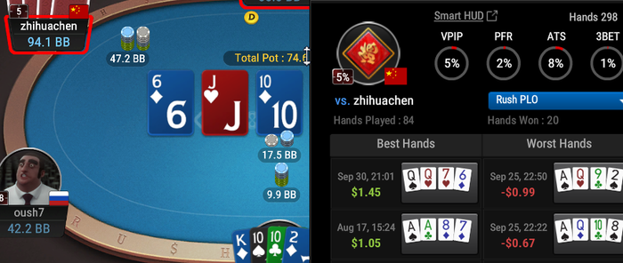 Решил поиграть в пло5 лимит пло10 и словил хороший ран в минус 35 би, скажем так играл так себе все же это не пло4 игра сложнее, префлоп ехать даже с хорошим АА не очень то и плюсово вышло у меня в этом отрезке в пять дней катки