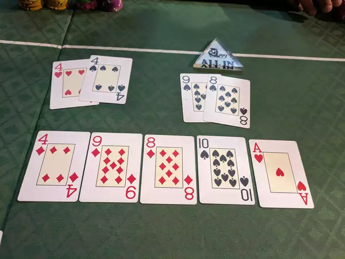 Вылет третьего игрока был в классическую монетку < без каких-либо попаданий в доску, а хедзап прошел в одну руку, возможно, это было и на второй руке, но так быстро, что я едва успел оформить вылет третьего. Рейз-алын-колл, очередная монетка и победитель зафиксирован в 4:34. Еще один рекорд.