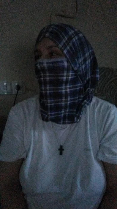 Март 2020-го, уединились у неё на хате в ковидные времена. В аптеках скупили все маски, она где-то вычитала, что можно делать маски из мужских трусов-боксеров, и это одни мои на её голове (чистые, новые, не волнуйтесь)). Выглядела как баба, которая поехала к игиловцу какому-то в Сирию. И я подхватил этот кадр.
