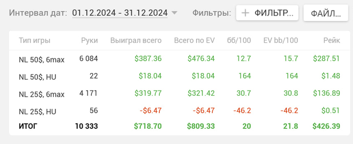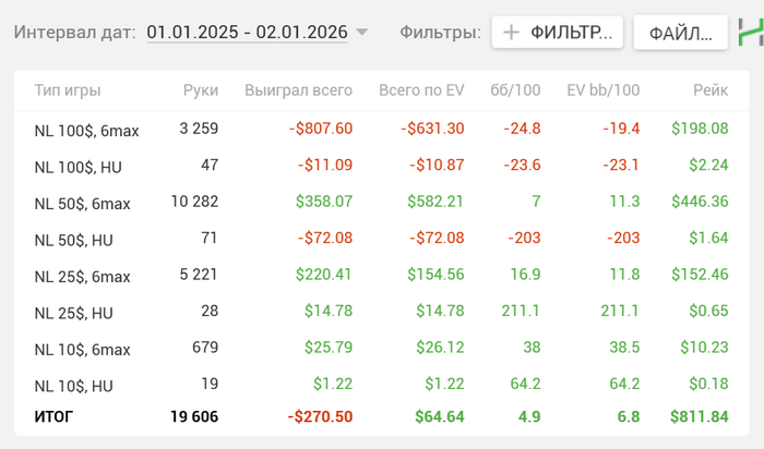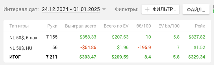 О планах на 2025 год: буду пытаться залезть как можно выше агрессивно шотая лимиты с бром 20-25би и спуском при минусе -5би. NL50 в конце года мне дался тоже не с 1 раза, я 2 раза спускался на NL25 и только с 3 попытки немного закрепился.
