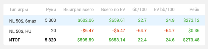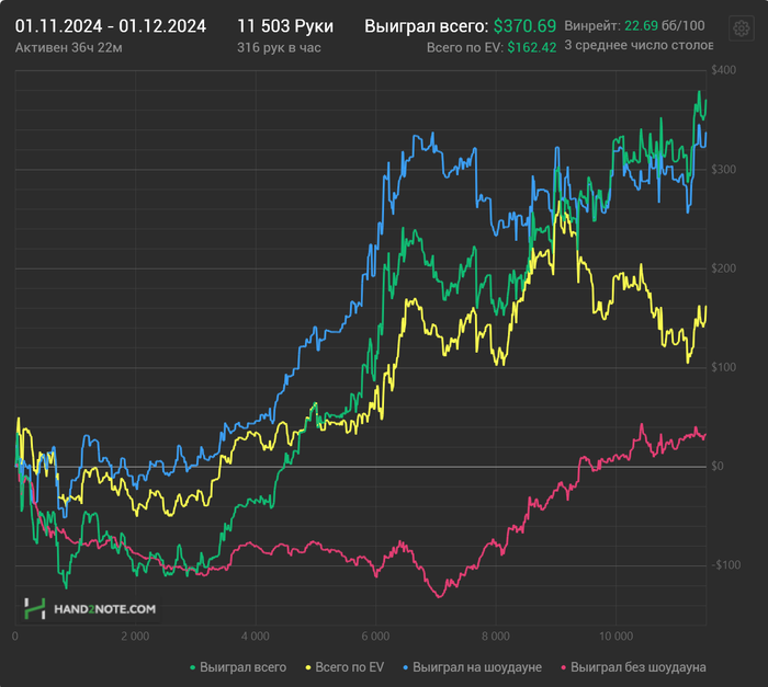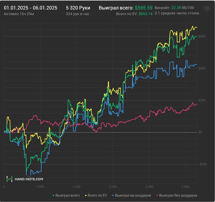 Раздач мало, но до конца месяца до 15к добью. В январе отыграю 25к+ раздач и постараюсь больше таких коротких дистанций за месяц не показывать.