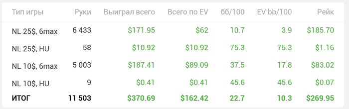 Играю я каждый день и 1 день в неделю отдыхаю. Другие румы подключать до нл100-200 пока не хочу, т.к игры достаточно.
