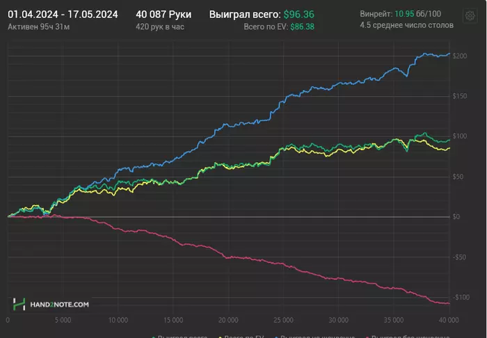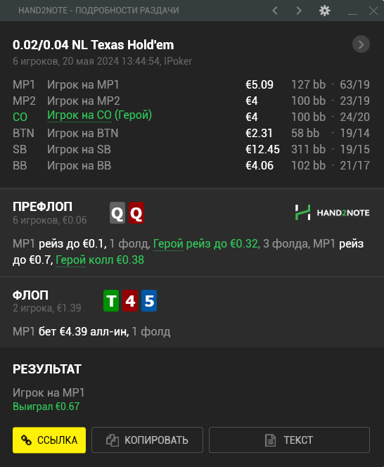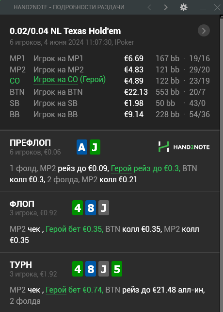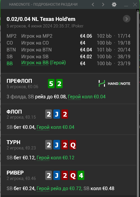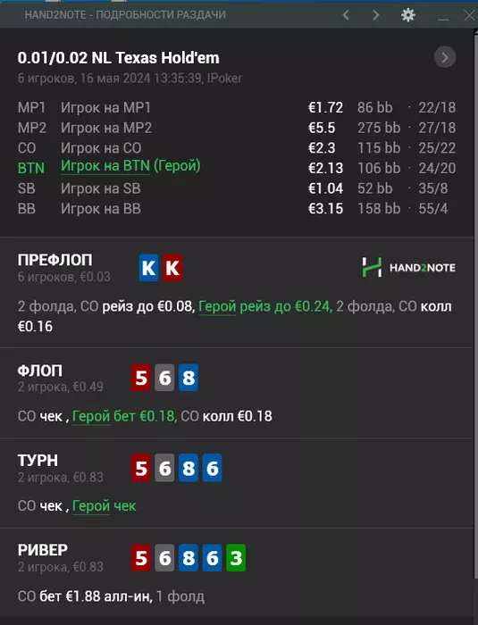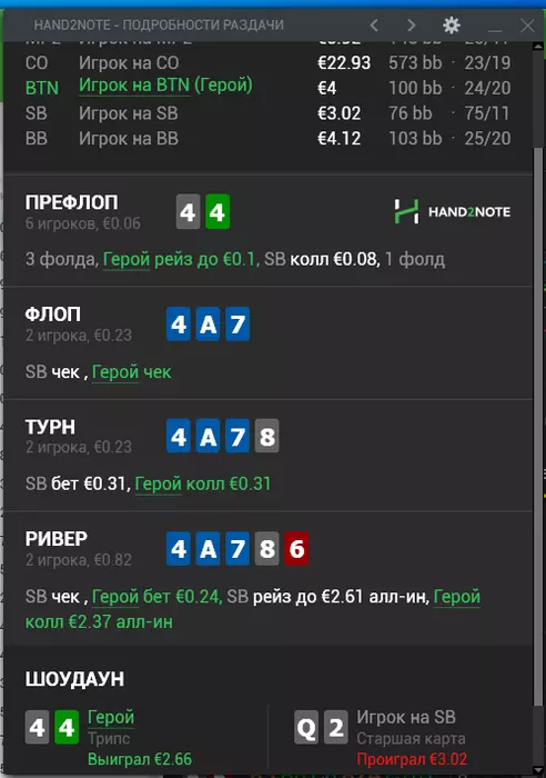 В итоге после такой линии мне лично сложно было бы принять решение на ривере. Типа терн бет - летит рейз - в целом зная нитовость поляны, можно рассмотреть фолд, т.к. чаще всего какие-то дро (здесь в основном дро по 7ке должны быть, бекдоров там считаю мало доехали до ФД) играют пассивно, но все еще опционально по оппоненту (т.к. будут все те же руки типа 99-JJ).