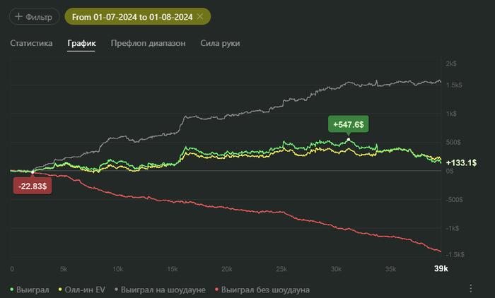 По графику видно, что в какой-то момент что-то пошло не так. Оно пошло и не только в покере. Но ныть не хочется, мусолить тоже. Пережили, едем дальше.
