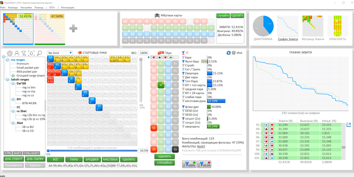 Спот СБ вс СО. Флоп цбетнул линейно, тёрн ставлю полярно. Сначала протыкал ручками свои велью беты и блефы по категориям. Затем обратился к математике. Сайз 66% - значит необходимое кол-во блефов в этом сайзе - 28%, кол-во велью - 72%. Значит, 40 комб велью и 16 комб блефа. И вуаля - почти всё сошлось, 16 комб блефов ровно набрались из фд и гатшотов (если не 3бетил А3с,А4с, то буду добирать из КД), а из велью пришлось только добавить JTs и тоже вышло 40 комб. Ура, я собрал косынку!!