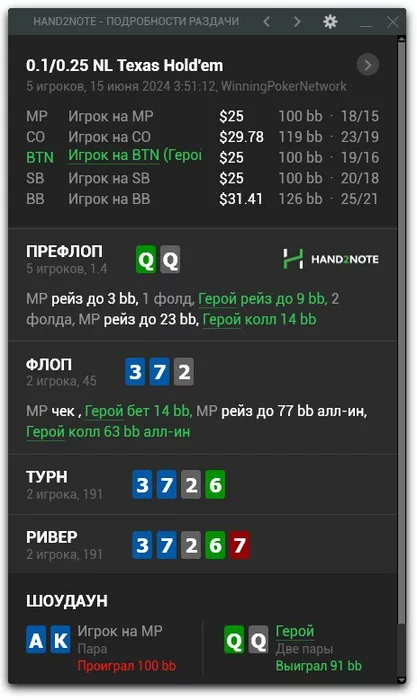 Раздача идентична предыдущим. Выходит - эксплойтим чеки тёрна от оппонентов. Единственное, мне наверное следовало бы здесь сыграть 4бет. Обычно, я не играю АКс от 100%го 4бета, но здесь получился мультипот и эквити руки стало меньше и распределилось на троих.