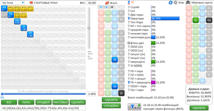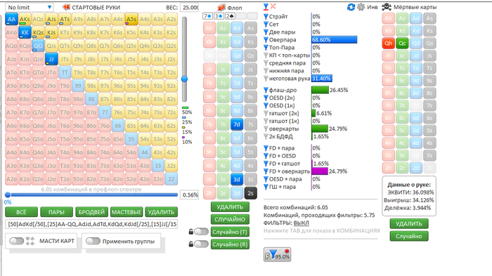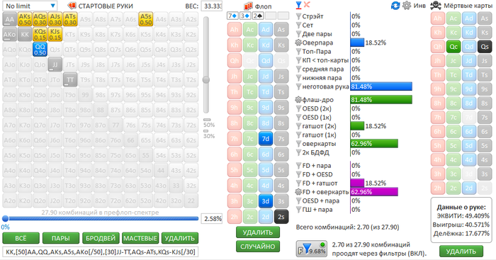 И если на флопе, он чек пуш все оверпары + руки с ФД, даже КВ-КД, то у меня далеко не монетка. Если порежу ещё какие то низы его диапа, то и эквити моих дам соответственно будет ниже.