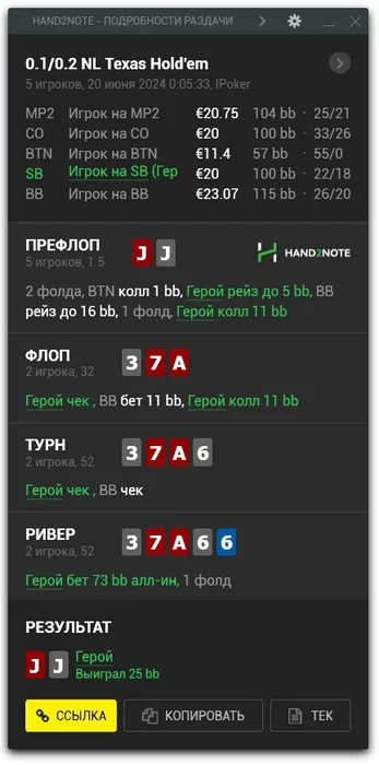 Ты доставляешь в банк 200бб 63бб, 63/200=31,5% эквити тебе нужно на колл, даже у тебя на скрине тут больше, после ставки в такой ситуации вариков на отскок просто нет.