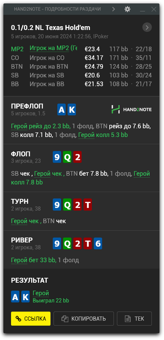 Флоп: низкий несвязанный борд с фд. У меня АК с тузом в масть - в руке много эквити и нет желания играть кбет, потому как на рейз уже придётся фолдить. Я выбрал опцию чек-кол.