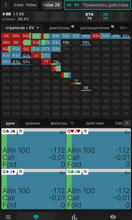 2- Ну пуш префлоп точно +ев действие, блеф очень тонкий, во первых опп может чекать слабые A-хай или A-хай с фд, может слоуплеить AA, + у тебя тут велью не очень много, кроме AQs и 77 ты особо ничего не репаешь, ну и блочить оба фд тоже не очень прикольно