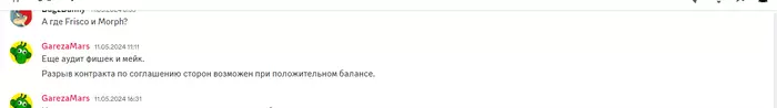 Можно бесконечно обсуждать пункты в контрактах и по ним я могу быть не прав и так далее, но объясните с моральной стороны, почему человек обвиняет меня в крупной офере с его фондом, не предъявляет никаких доказательств, а к концу обсуждения как мы видим, что у него по сути ноль аргументов, он прикрывается пунктом в контракте, который с моральной точки зрения выглядит очень странно, учитывая, то что его фонд по сути треснул по швам. Человек создал арбитраж, провалил все пункты обвинения и теперь просит еще 2 месяца на аудит фишек. Абсурд разве нет?