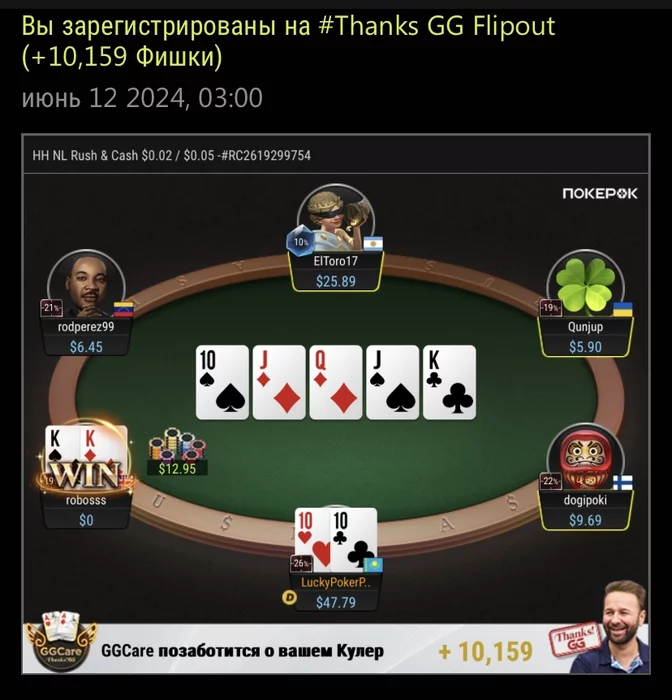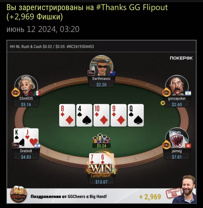 alchx @ 12.06.24Даже 1 карточного Qхай флеша хватает на 4флеш бордах, если банк огромен.