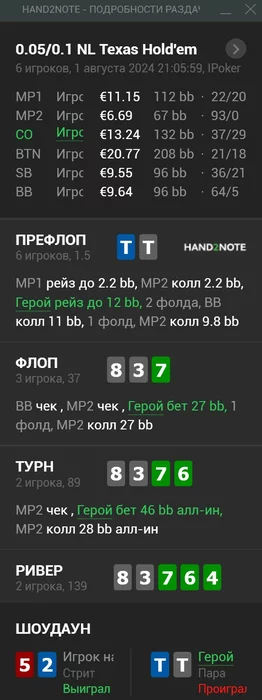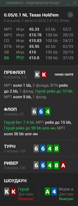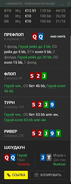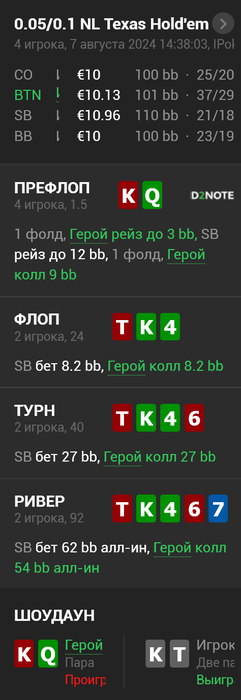 Сам я, конечно, едва бы коллил вторые пары, но: очевидно, что под достаточно агрессивного оппонента это не будет плохой игрой. С KQ же - это изи колл. Просто стоит помнить, что практически любая рука на ривере у нас является блафкетчером, и мы по факту пытаемся отбить ими часть своих уже проигранных денег, а не заработать на них.