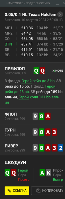 Третье: не верю в широкий 5бетпуш в таких стеках против твоего 4бет сайза. В 90% случаев там скорее стандарт вроде QQ+, AK. Есть эквити на колл против такого ренджа? Не знаю, надо считать, но против 21/15 я бы скорее выбросил. Это спорное утверждение с моей стороны, но учитывая факторы завышенного сайза 3бета и пуша на 160бб против небольшого 4бета + статы 21/15, фолд уже не выглядит таким невероятным.