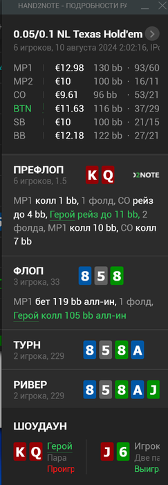 После такого узкого кбета флопа SB, на тёрне, как ни странно, мне пришлось выкинуть почти все стрит-дро с QJо, слабые гатшоты (пару даже с ФД - Q8s, Q9s, J9s), почти все сильные гатшоты. Опять же я бы овербет-пушил тёрн с частью диапазона, а остальное ставил средней ставкой, а это немного путает, потому что от подобного количества вариантов голова идёт кругом.