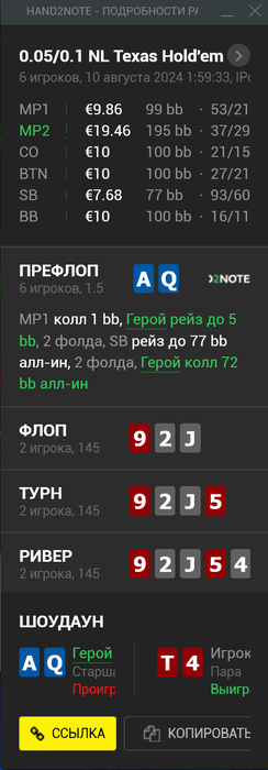 BobrKurva, вот и я так тоже подумал что там полно недоехавшего и спокойно можно найти 5-8 комб которые не доехали, там спокойно лежат еще и JJ и ДД которые превратили в блеф, теже самые KD с которыми мы делим тоже есть в частоте, да блочим но есть же тоже а что бьет не так и много АА КК К10 1010.