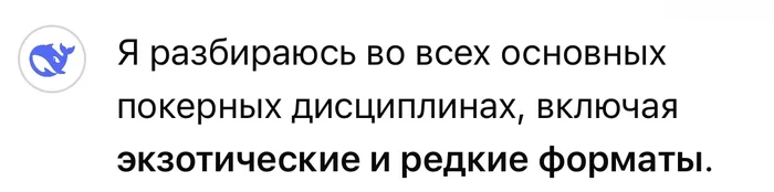 Заходим в чат с ИИ и предлагаем сыграть ХА. Ожидаемо получаем согласие — осталось определиться с дисциплиной. Оказалось, что сетка знает более 100 разновидностей покера, некоторые из которых вряд ли известны даже заядлым каталам — омаха с элементами манчкина и микс NL, Ruzz и Stud.