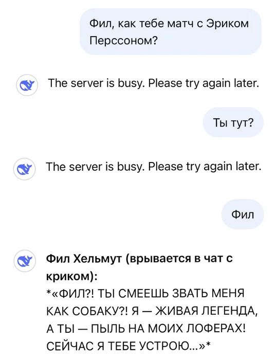 Выбираем Фила Хельмута. Просим бота выбрать пресет на основе базы раздач из общего доступа и классическую манеру поведения Фила — и получаем сообщение, что во время сессии возможны оскорбления! Спрашиваем, будет ли в них нецензурная лексика. Ответ — нет.