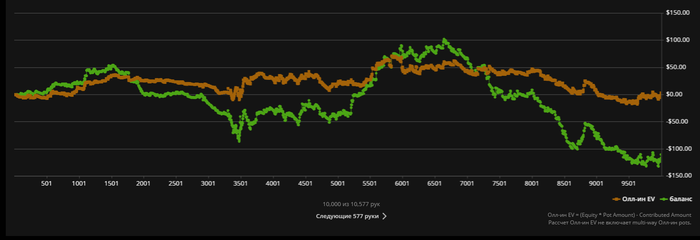 Бро, на дистанции в 10к рук при том что ты играешь окей и не отмораживаешься, основное влияние на результат будет оказывать удача.