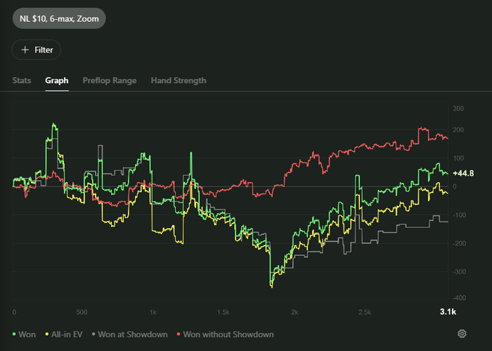 Перешел на десятку. По скиллу отличий от NL5 не вижу вообще. Но ГСЧ решил устроить проверку на прочность. Сыграл 3к раздач в ноль. Синяя линия страдает: регулярно сдают кулера в 3-бет потах (оверпара в сет и т.д.).