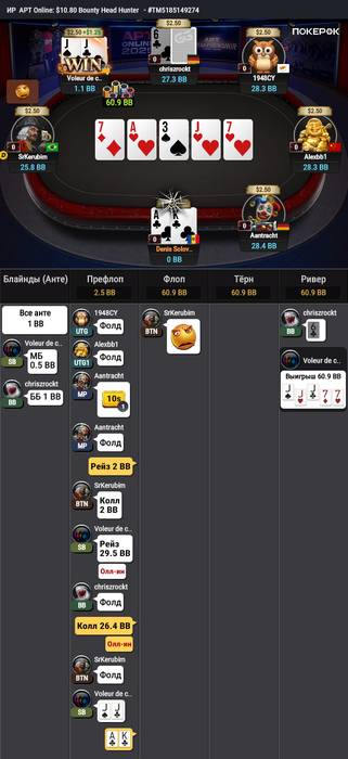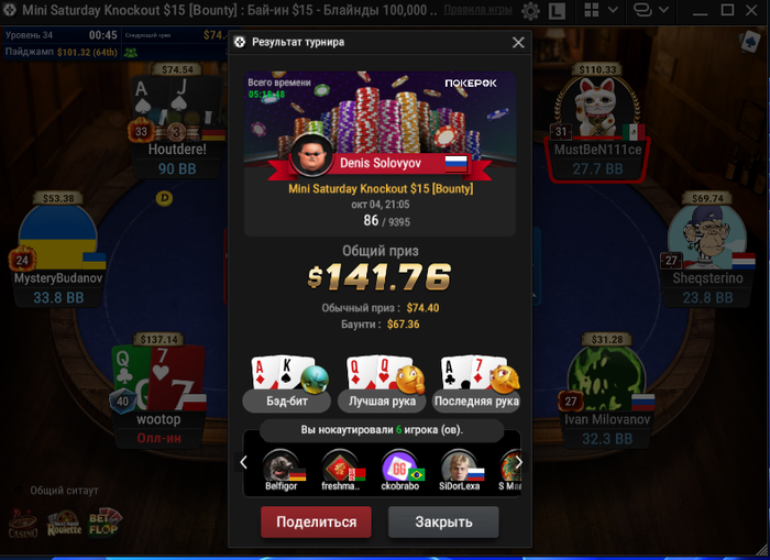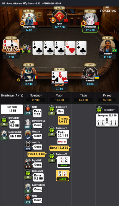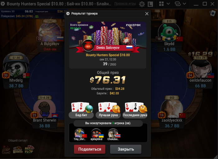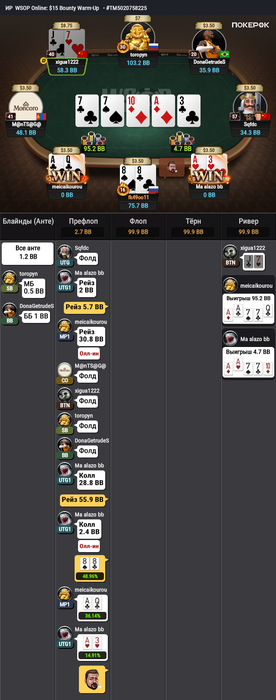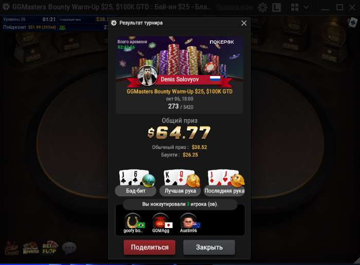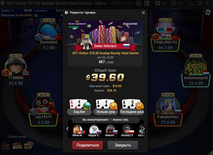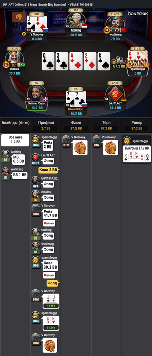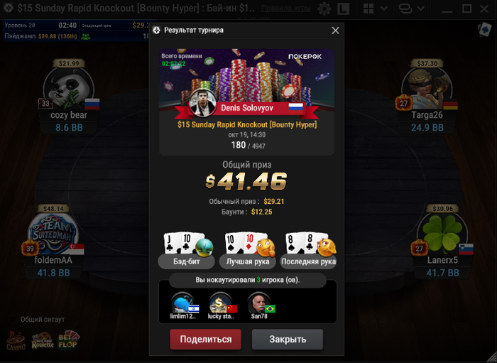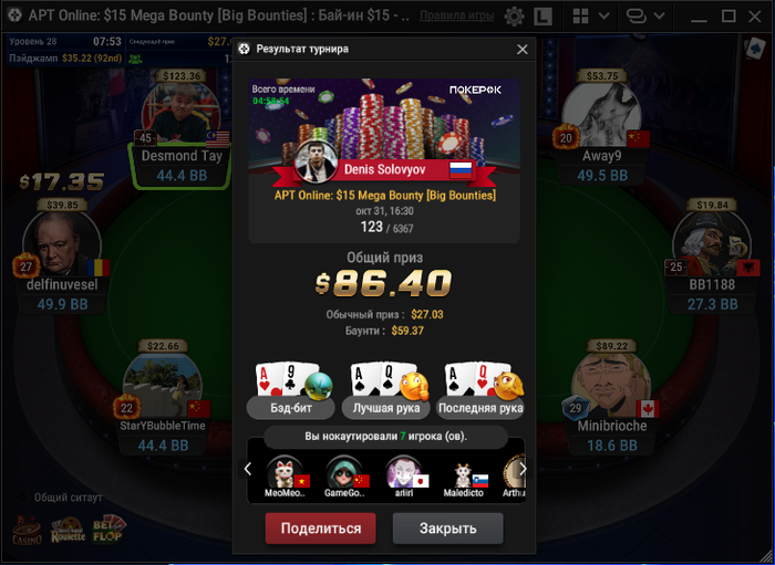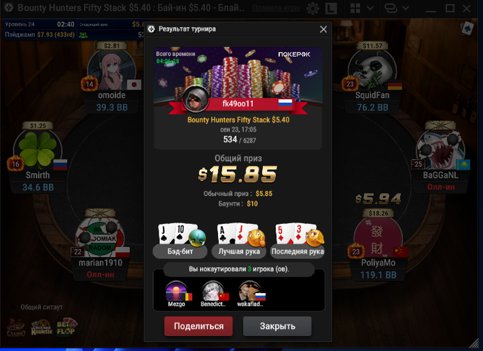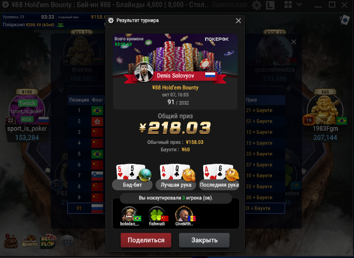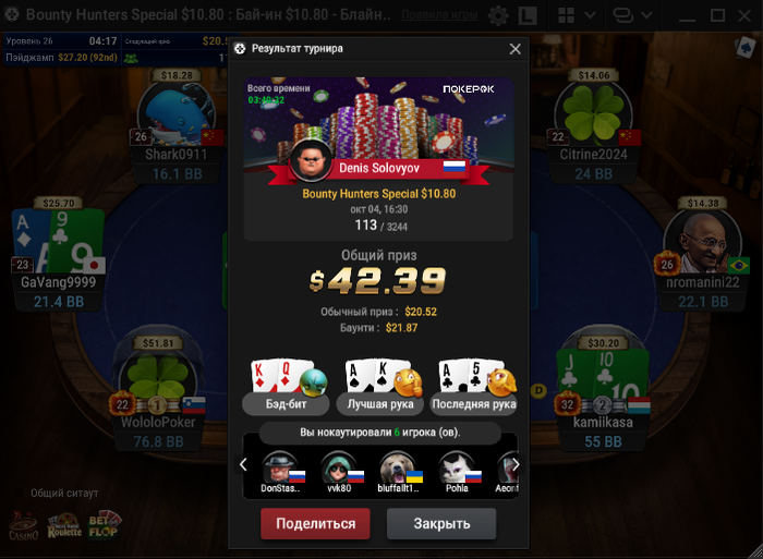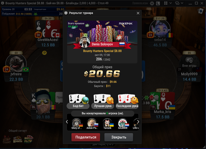 Везде выступали не плохо. Во фрироле проиграл Глебу Тремзину он с батона AQs vs наших 77, не устояли! И в 2-х баунти были повержены наши старшие тузы в довольно важных стадиях