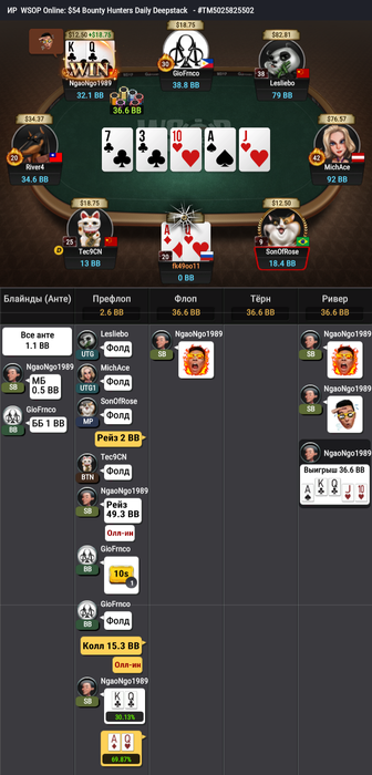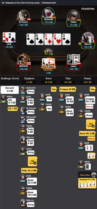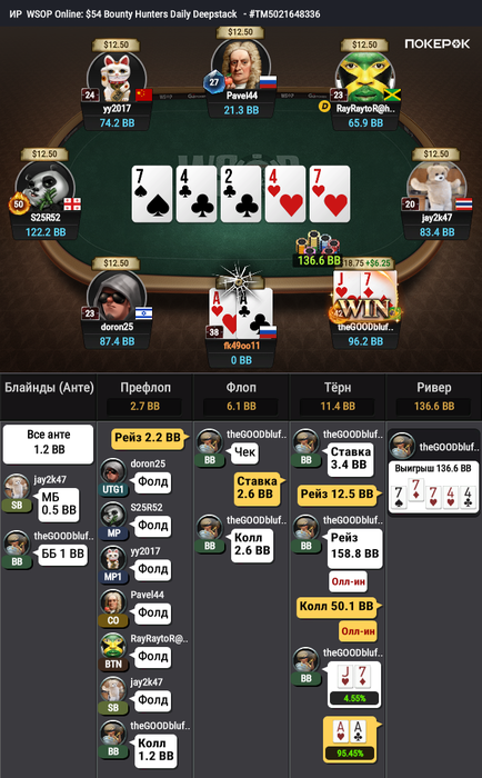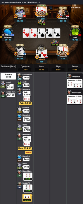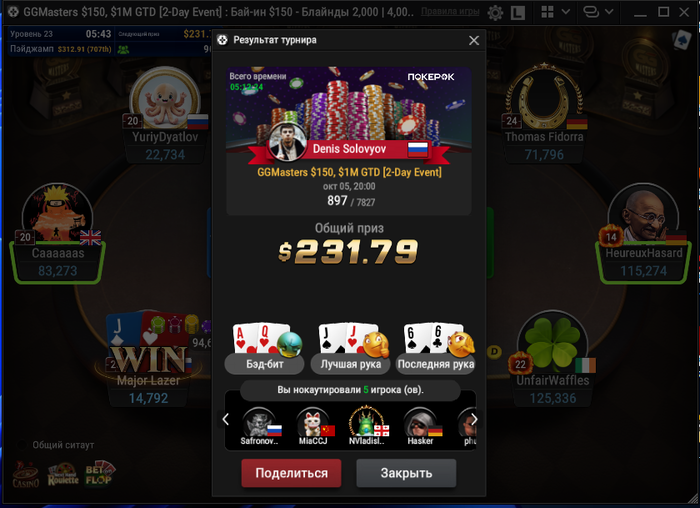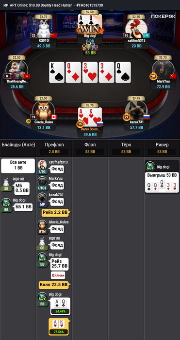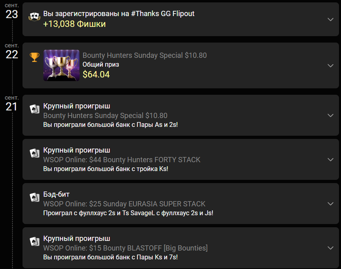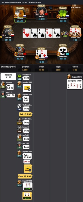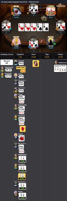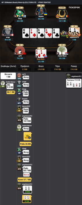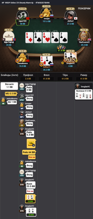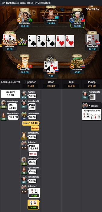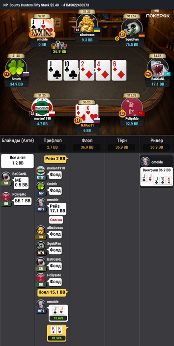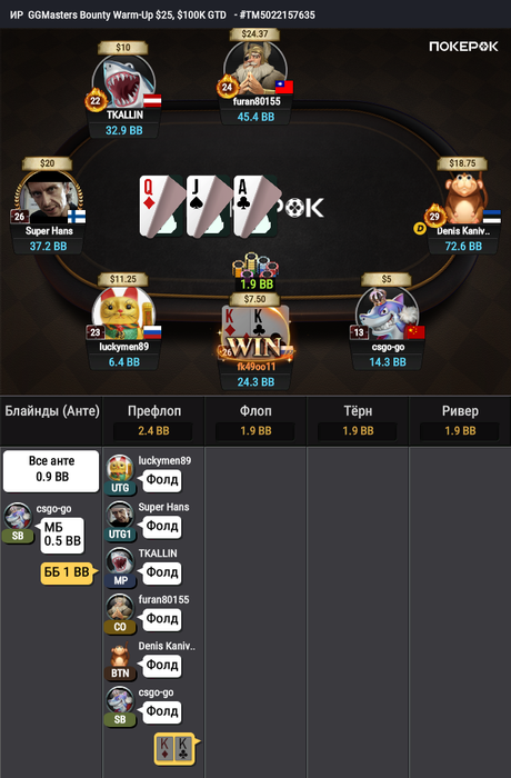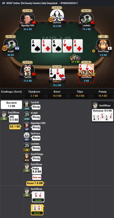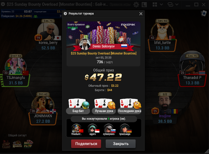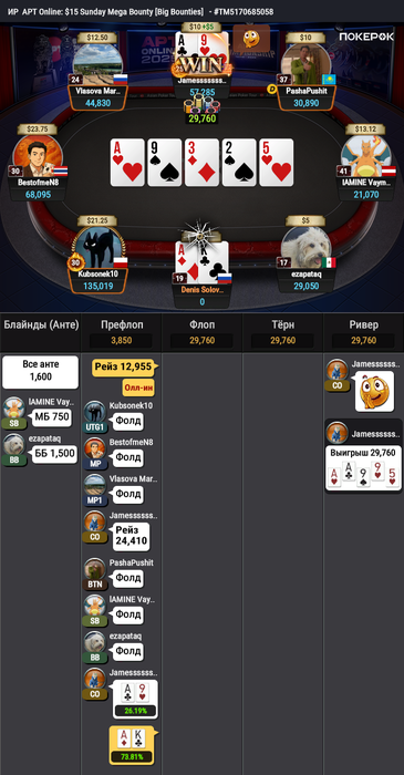 Везде выступали не плохо. Во фрироле проиграл Глебу Тремзину он с батона AQs vs наших 77, не устояли! И в 2-х баунти были повержены наши старшие тузы в довольно важных стадиях
