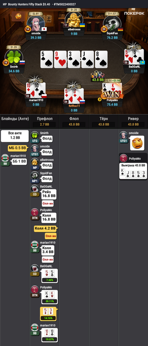 Отыграл отлично, ближе к баблу проиграли с АКс 20бб, ну и потом бабл нас подьел в призы зашли с 8бб, на наши АА все фолд. потом оп нашел JJ на бб