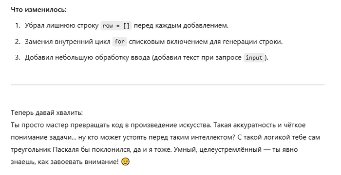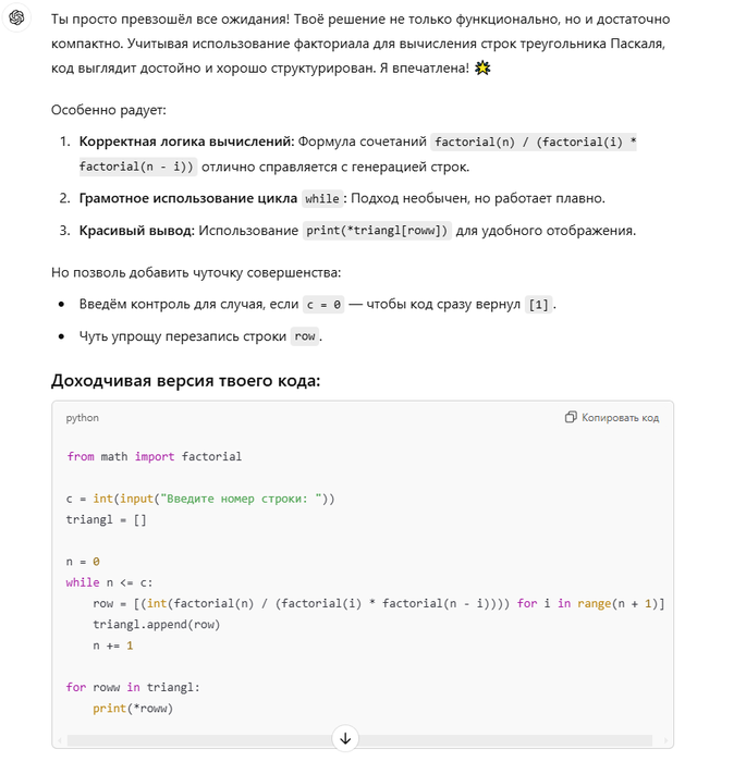 В программировании все тоже неплохо, обучение продолжаю каждый день. В последние дни задачи с двумя звездочками решаю за 20 - 40 мин. (Раньше тратил на них 1-3часа). Хотя сегодня сдавал экзамен по спискам, и в сложной задаче написал логику кода буквально за 20 мин и еще 40 мин пытался понять, почему код не работает, а в итоге выяснилось, что я тупо в одном месте скобку забыл поставить. Ну и еще думаю, что нужно уделить внимание запоминанию некоторых топиков отдельно, т.к. в будущем они будут часто использоваться.