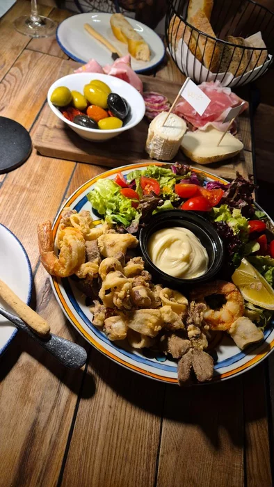 В итоге от пасты и пиццы мы сегодня отказались и взяли на двоих микс "морских гадов" во фритюре, тарелочку ассорти сыров и колбас и вино)