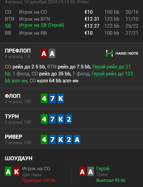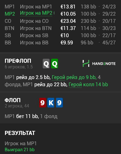 Я бы после такого плоского 5бета QQ+ AK+ сфолдил не задумывась) Но опп решил заколить АК что он интересно там хотел увидеть. Теперь надо его проверить по базе и посмотреть как он играет АА/КК и написать подробный нотс.
