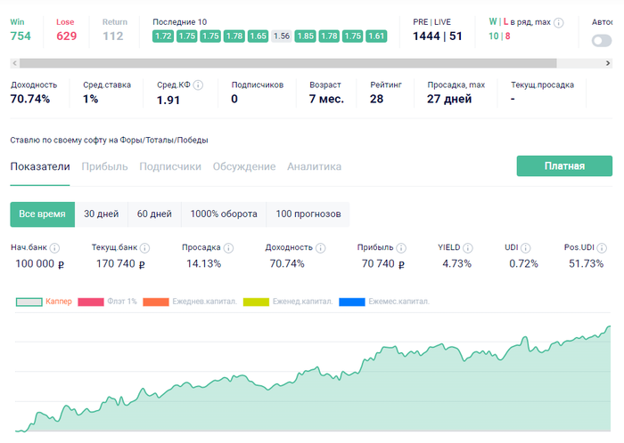 По беттингу иду так. Здесь используется смешанная страта. Тестирую ее 7-й месяц одна ставка 10$. Радуют последние 10 ставок.
