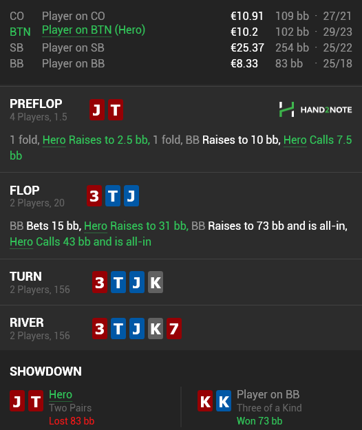 На момент раздачи опп был непонятный, борд очень дровянной, будут ли здесь рейзить дрова? Думаю вряд ли , поскольку такие руки не колятся скорее всего в этих позах. Против плотного 3бета руки типа QJs будут часто под доминацией, поэтому наверное нужно было фолдить.