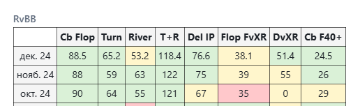 Очень нравится личный кабинет игрока, где наглядно видна вся статистика, разбитая по цветам от красного к зелёному, где наглядно видны отклонения. Для примера покажу RvBB, BBvR, ССvR за последние 3 месяца.