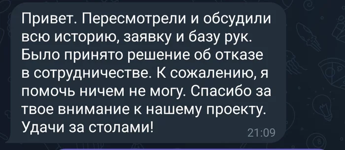 Месяц переговоров, слов о том что нужна база свежая с хорошим вр, а на арбитражи закроют глаза, но похоже, как мне кажется мою заявку вообще не рассматривали ))))