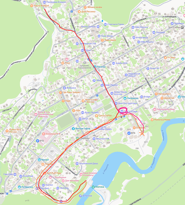 А где крест оранжевый, там раньше был проход к реке на обзорную поляну, но сейчас все закрыли какой-то стройкой/забором, как нам подсказали девушки из магазина в этом месте.