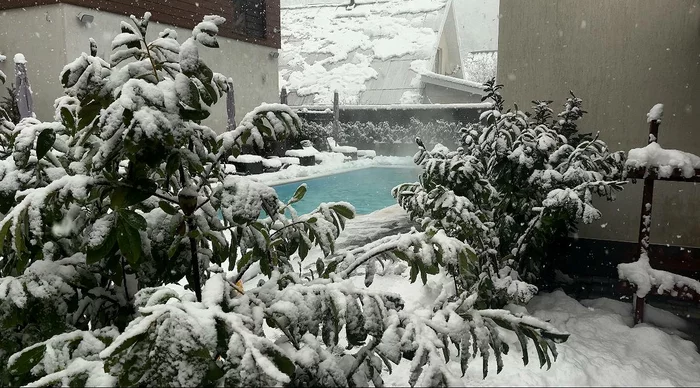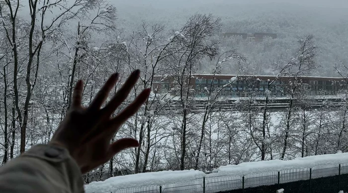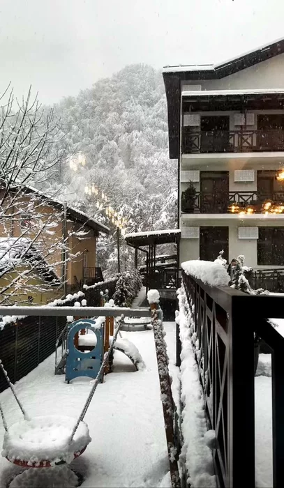 • Вечером Поляну начало засыпать снегом, и мы даже прогулялись, пытаясь выйти к реке, чтобы посмотреть на горный поток воды между сугробов...