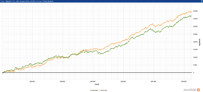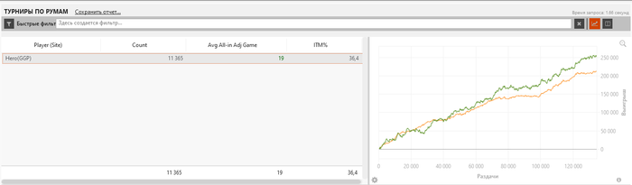 Тут на Гт рег спинов себя в накаут на стриме отправил хуяря себя по лицу после победы в большом множители и явно это не от хороший и весёлый жизни. В покере всюду дисперссия, но где-то можно сгладить где-то нет. Да и играть без пула спины в целом такая себе затея. Кэш тоже может удивлять даже против жирных випов. Вчера тот же вип мог меня со своими 15% на терне уебать два ривера и не было бы красивого графика ✌️😂 Вопрос дистанции и селекта, но я тупо открыл 6 столов и играл, а можно нагло садиться только под человека с 60+ впип и не играть с идиотами, у меня два из 6 столов было с людьми которые играли впип 10-17 и те два стола как бы лучше я не играл нитов не бьётся рейк.