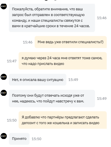 следующим сообщением они напишут, что извинятся и передают вопрос специальной команде, пропадут на месяц, и снова попросят записать видео транзакции...