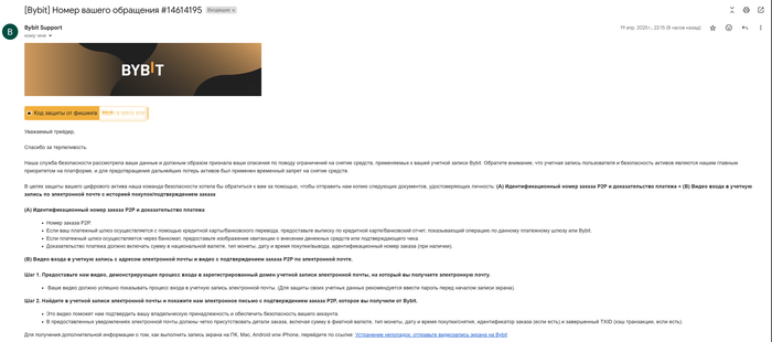 3. после того как всё вывел, забил на байбит, но в конце апреля решил ещё раз написать... в итоге как я писал выше у меня сначала запросили те же требования по видео, но потом неожиданно решили, что достаточно документов и селфи... видимо потому что увидели, что на счету нет денег...