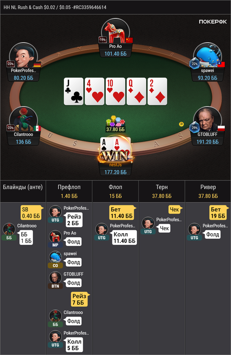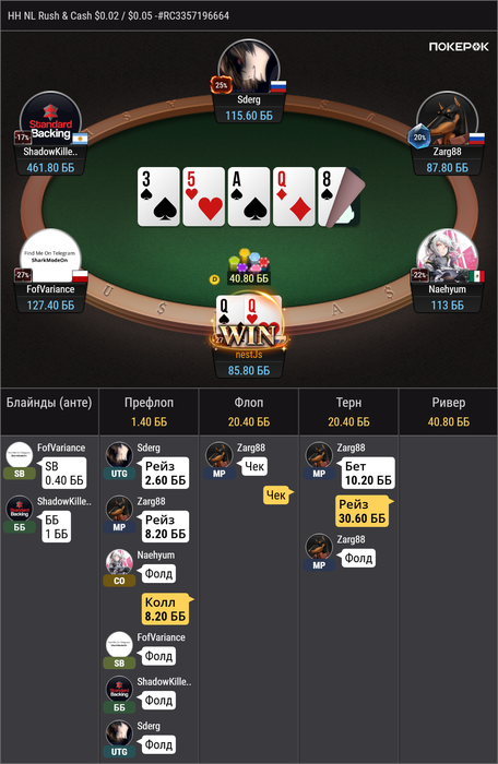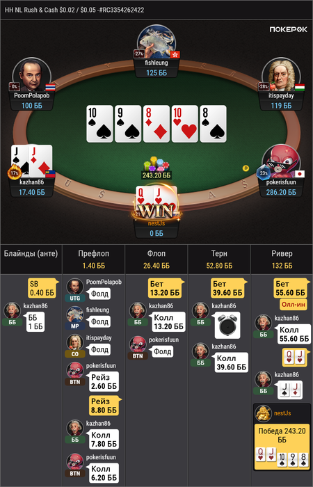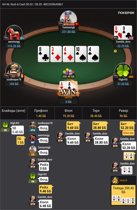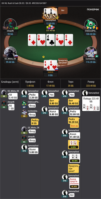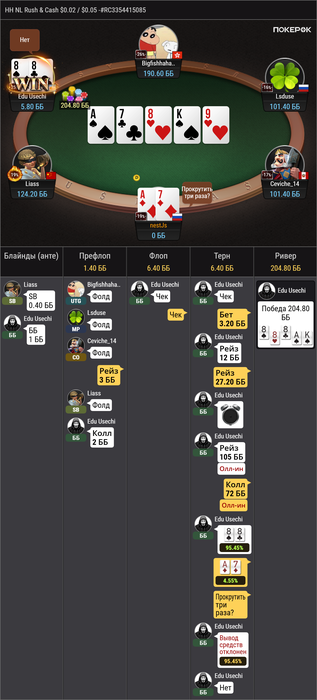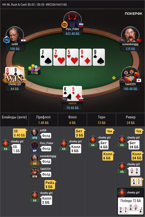 на ривере решил, что хватает рук которые слабее, которые заплатят, но сами не поставят. не побоялся флешей и фулл-хаусов, за что получил награду