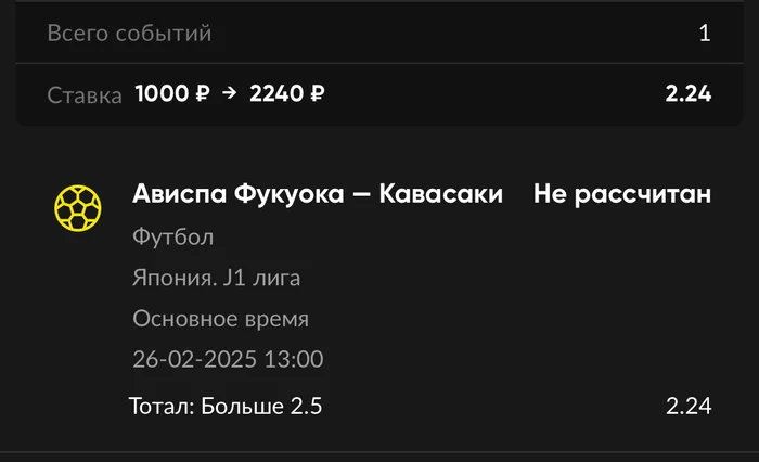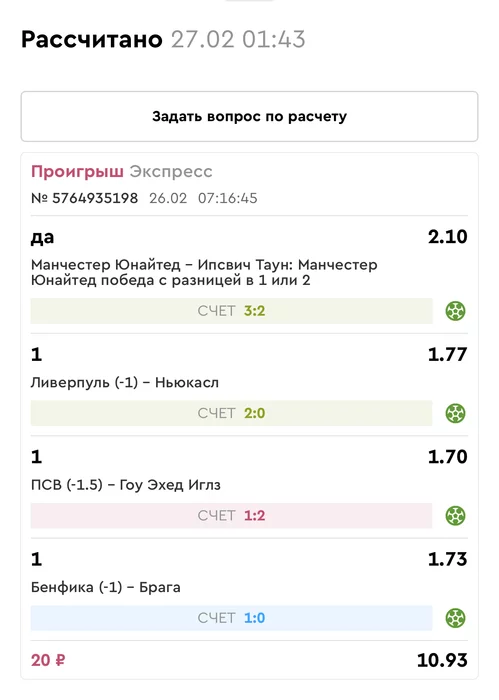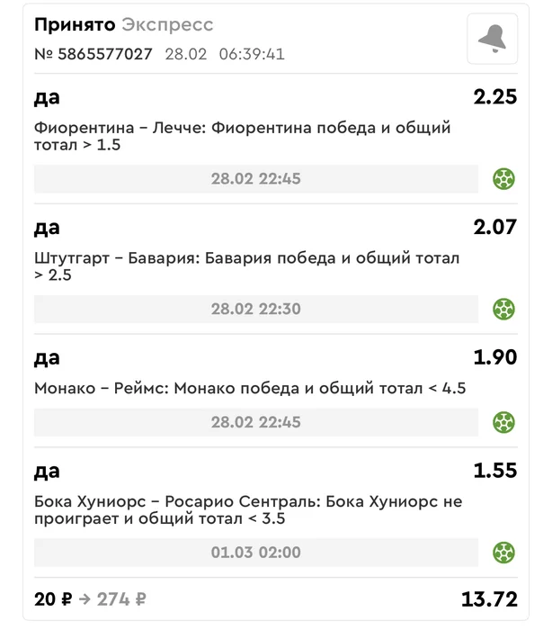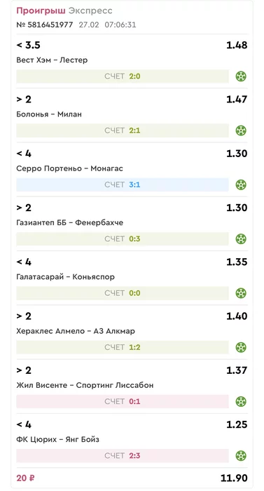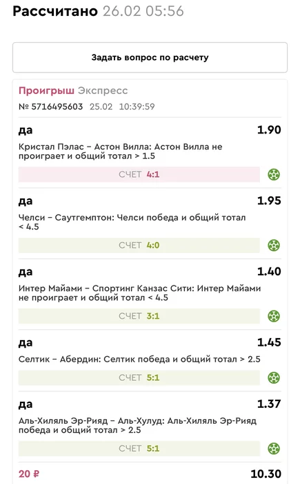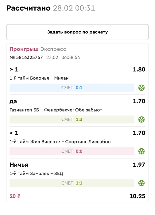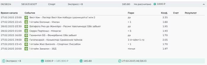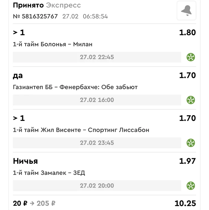 Проигрыш всех экспрессов 25.02.25 - 6 000р, догоны до денег не доехали. . Прибыль за год по экспрессам 79 200р, за февраль 42 320р. По догонам с начала года наша прибыль составляет 228 560р, за февраль по сегодняшний день наша прибыль составляет 111 600р. Таким образом с начала года наша общая прибыль 315 760р, прибыль за февраль 159 920р! Экспрессы на сегодня 26.02.25.