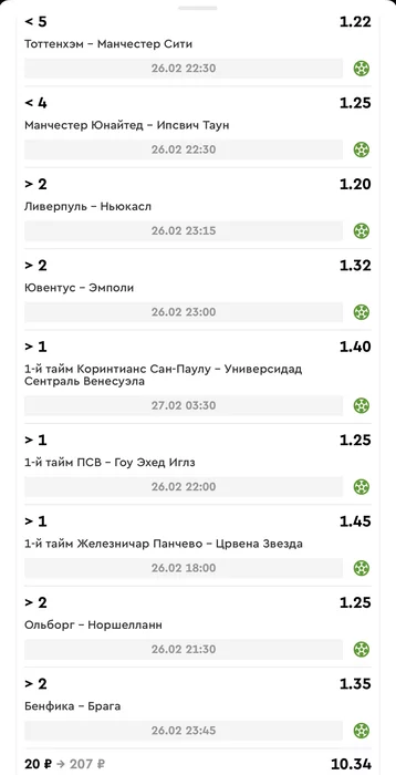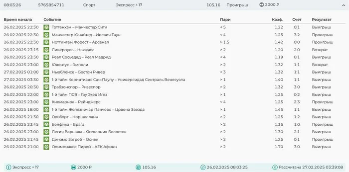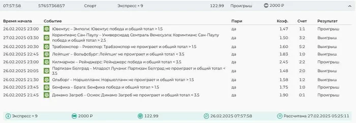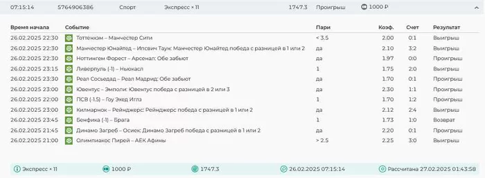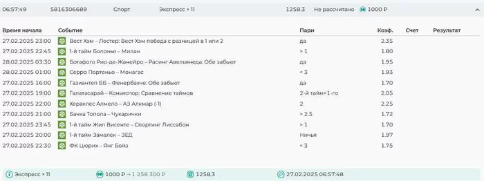Проигрыш всех экспрессов 26.02.25 - 6 000р, По догонам +1240 р соответственно . Прибыль за год по экспрессам 73 200р, за февраль 36 320р. По догонам с начала года наша прибыль составляет 230 600 р, за февраль по сегодняшний день наша прибыль составляет 112 840р. Таким образом с начала года наша общая прибыль 311 000р, прибыль за февраль 155 160р! Экспрессы на сегодня 27.02.25.