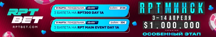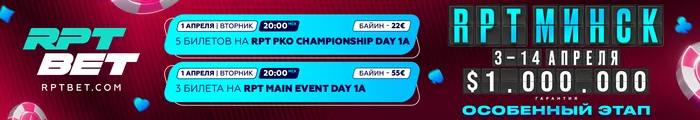 💰 В сателлите к RPT Main Event 2 апреля гарантия увеличена с 3 до 4 билетов;