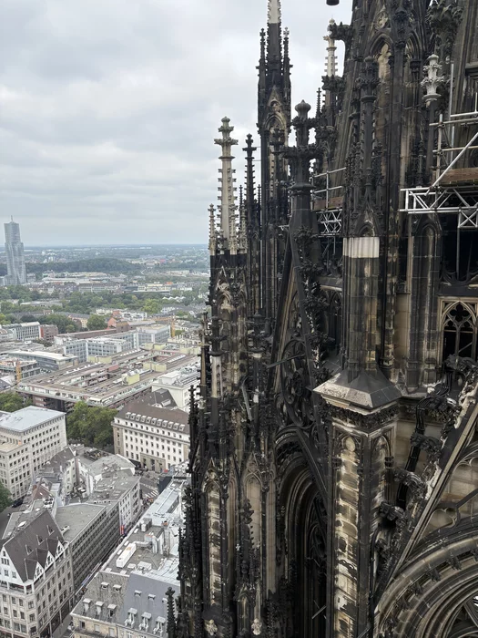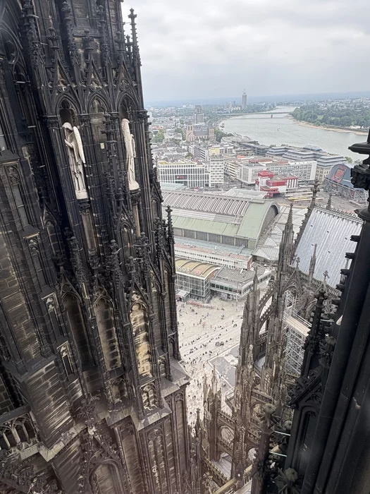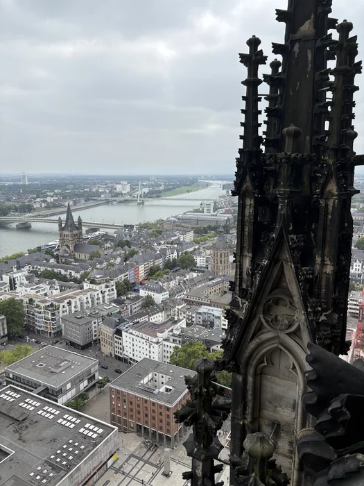 Еще фото после концерта, проходили мимо Кёльнского собора. Днем и ночью виды разные. По пути почему-то местные менты устраивали массовое набутыливание. Не знаю, что там происходило, может какие-то локальные проблемы, но выглядело довольно жестко. Я не успел снять, но один парень просто висел на заборе без футболки, а вокруг его окружили менты. На следующий день, как и обещал, поднялись наверх. Но подруге стало плохо примерно на середине, там винтовая лестница метров 30, не меньше, можно реально закружиться. Зато виды сверху огонь, стоило того.