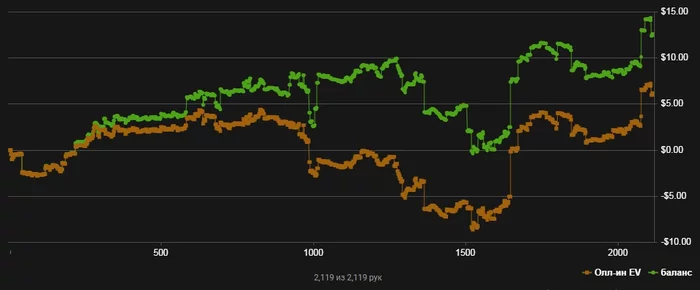 Отыграл сегодня все сессии, каждая около 1000 рук - всего 1989. Получился небольшой минус. Мог быть около 1 бай-ина, но спасли плюшки. В двух крупных спотах поплыл. В первом случае вскрыл один мудак блеф на стэк. У него доехала по риверу вторая пара, там был бланк. Если бы не доезд, выбил бы его из банка. До этого этот румынский хер выиграл монетку на стэк - терном флэш закрылся. В то же время было интересно с ним поиграть, к слову, на трех столах имел на меня позицию. Лузово защищал ББ трибетом. Нетипичная игра для лимита NL5.
