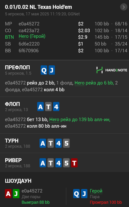 tymbaumba, салют, да-да, коин это часть покера и всегда уж в ноль. Еду не всегда, но бывает. Так как сыграл чек-рейз, а опп пушнул, у меня там только кол)