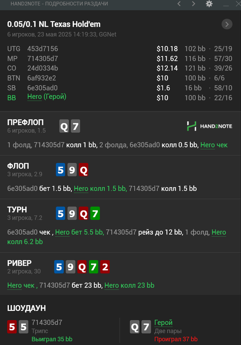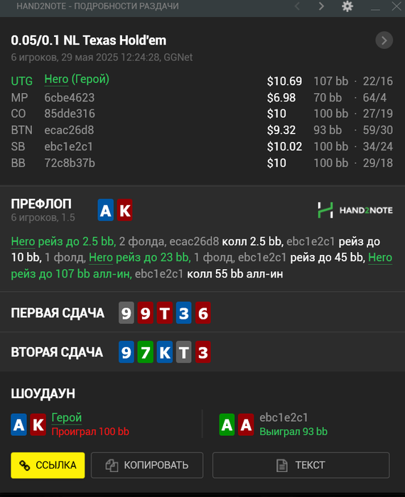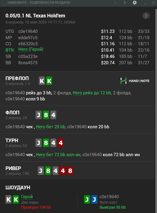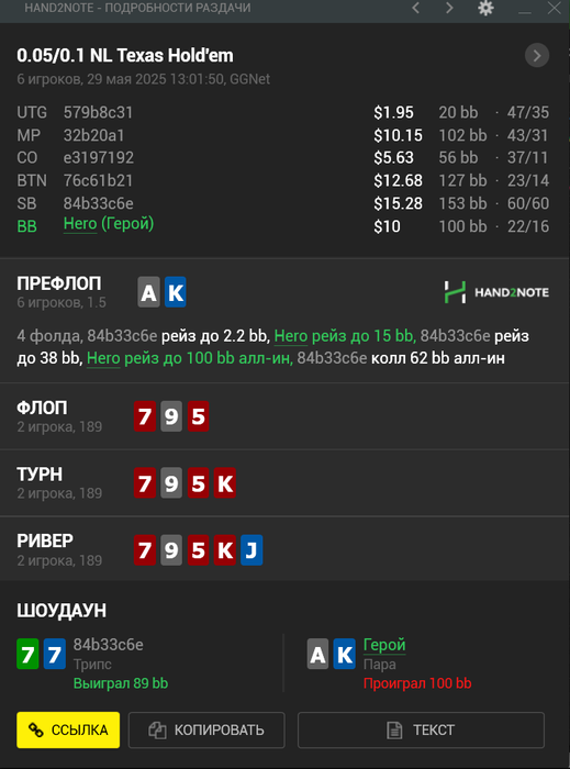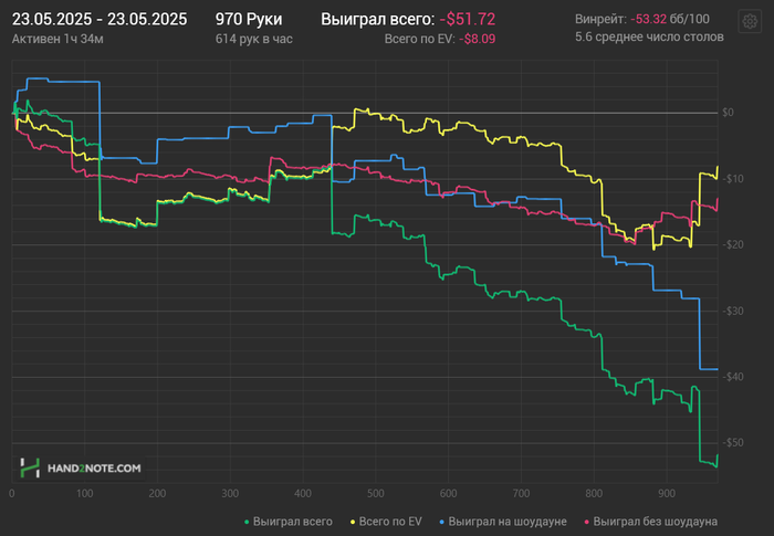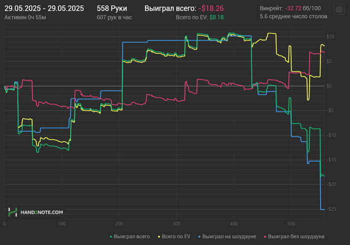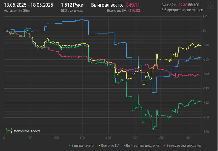 Вторая сессия вышла получше, почти отбил весь стрик диспы, ошибок мелких много было и одна ошибочка на стэк) Но в целом играл хорошо. EV немного вернула, было около 5ти коинов, ни одного не проиграл, были только дележки и вин