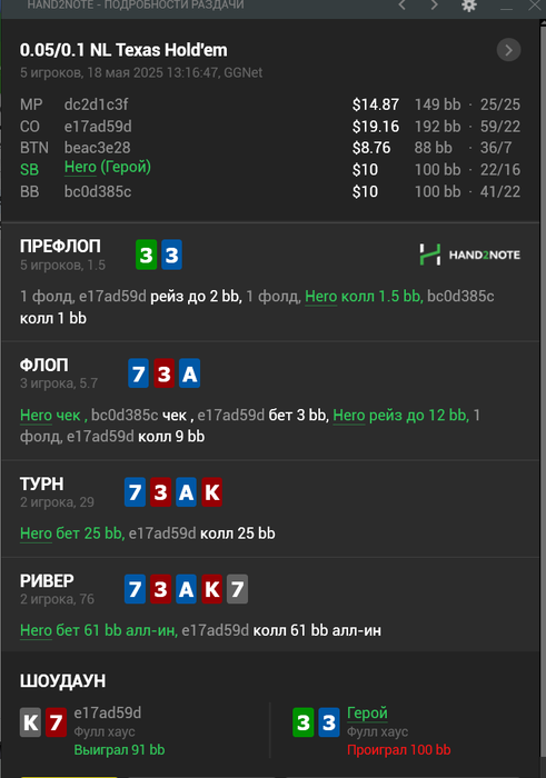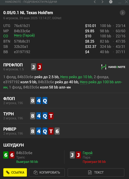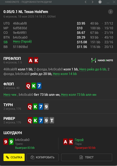 А по твоей раздаче я бы изолейтил в 8-9бб минимум, чтобы всякие мелкие пары не колили лишний раз, да и другим будет уже страшно.) И пушить сразу не стал бы, так как это ж не 4бет пот, можно поиграть через рейз или кол. Да и сдаться можно всегда на терне или ривере, мыж не привязаня с флопа к банку, как думаешь? Ну пуш тоже ок, я не эксперт, но эквити явно хватает против такого оппа :)
