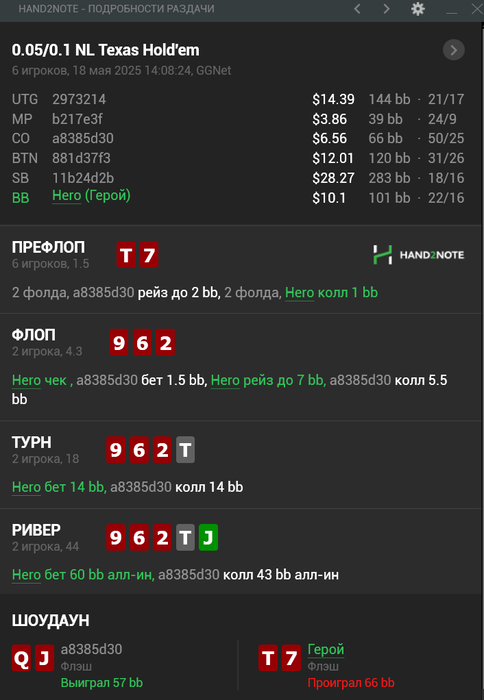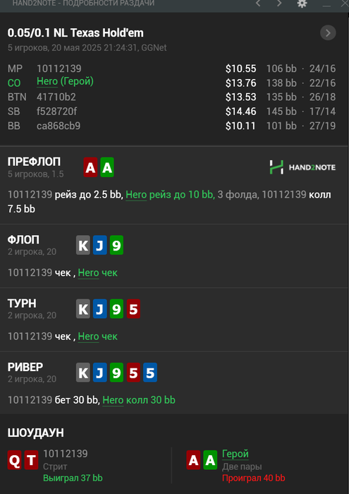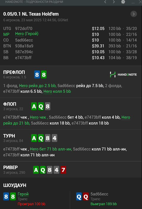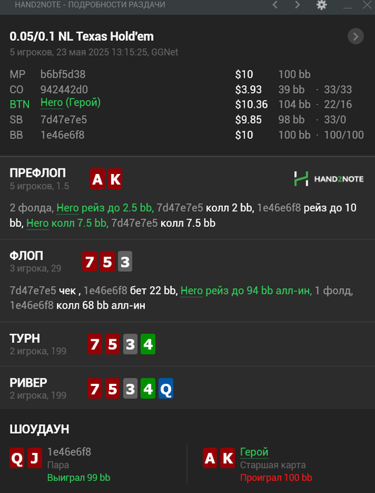 3. Так тут сложно, можно было сфолдить на пуш против среднего регуляра, так как против утюга диапазон 3бета/пуша будет узкий. Ну или заколить можно было , поиграть в позиции, это я понимаю. Далее, почему сыграл именно так. Потому что чел был замечен и 3бет и 4бет с QTs и ещё много раздач, помечен лузовоагром, что я и вижу всегда. НО РАЗДАТЬ НАДО ИМЕННО ТАК.